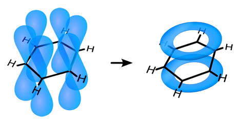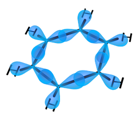 ბენზოლის მოლეკულის ყველა ატომი ერთმანეთთან ჩვეულებრივ დაკავშირებულია უპირველესყოვლისა მარტივი, ერთმაგი, ბმებით. უკანასკნელნი გამოსახულნი არიან ნახ. 3A–ზე. საჭიროა აღინიშნოს, რომ ამ ბმებში მონაწილე ყველა ელექტრონი ერთმანეთის იდენტურია და ისინი მოძრაობენ sp2–ჰიბრიდული ორბიტალებით. მათი ურთიერთშეკავშირების შედეგად მიღებული სტრუქტურა გახლავთ სრულიად ბრტყელი, ანუ პლანარული, ხოლო აღნიშნულ კავშირებს (ერთმაგი ბმებით) σ–ბმებს (სიგმა) უწოდებენ, რომლებსაც ორგანულ ნაერთებში გააჩნიათ გამორჩეულად მაღალი მდგრადობა. მათგან განსხვავებით სტრუქტურაში არსებულ იგივე ნახშირბადატომებს შორის, როგორც უკვე აღინიშნა, არსებობენ უჯერი კავშირების წარმომქმნელი ელექტრონები, რომლებიც მოძრაობენ pz ორბიტალებზე. იმ პირობიდან გამომდინარე, რომ ახალ კავშირებს არ შეუძლიათ არსებული σ–ბმების სივრცე დაიკავონ მათ უწევთ ურთიერთკავშირის დამყარება სტრუქტურის სიბრტყის ზემოდან და ქვემოდან, შესაბამისად დამატებითი, უჯერი, კავშირების ღერძები მოლეკულური სტრუქტურის პერპენდიკულარულ მიმართულებას დაიკავებენ. ამ კავშირებს (პი) π–ბმებს უწოდებენ (ნახ. 3B), რომლებიც სიგმასაგან განსხვავებით ჩვეულებრივ არამდგრადობით და მაღალი რეაქციის უნარიანობით ხასიათდებიან. თუმცა არენების (არომატული ნახშირწყალბადების) შემთხვევაში უნდა აღინიშნოს, პირიქით, ანომალურად მაღალი მდგრადობა.